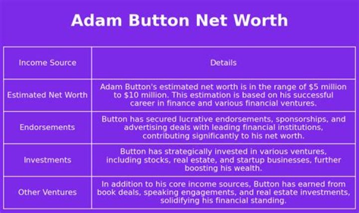 history | January 14, 2026 Adam Button Net Worth Adam Button Net Worth 2024: Wiki Bio, Married, Dating, Family, Height, Age, Ethnicity Adam Button net worth is $4 Million Adam Button Wiki: Salary, Married, Wedding, Spouse, Family Net Worth$4 MillionProfessionActor