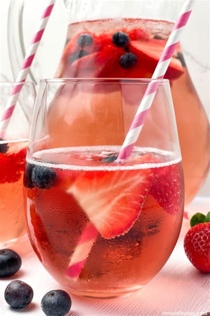 Strawberry Sangria - White wine or rosé, flavored with fresh strawberries, raspberries, oranges, and homemade strawberry syrup.
