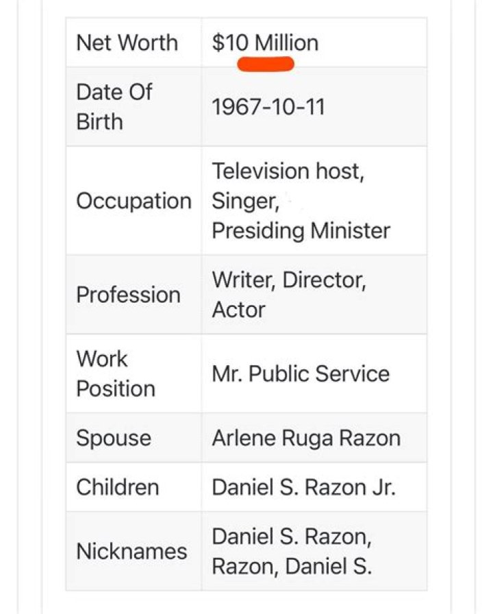 Net Worth $17 Million Date Of Birth 1967-10-11 Occupation Television host, Singer, Vice-Presiding Minister Profession Writer, Director, Actor Work Position Mr. Public Service Spouse Arlene Ruga Razon Children Daniel S. Razon Jr. Nicknames Daniel S. Razon, Razon, Daniel S.
