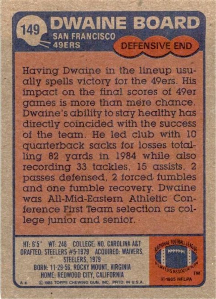 Dwaine P. Board (born November 29, 1956 in Rocky Mount, Virginia) is a former defensive line coach for the Cleveland Browns of the National Football League. He is also a former American football defensive end who played for the San Francisco 49ers and the New Orleans Saints from 1979 to 1988.Board played college football at North Carolina A&T State University and was drafted in the fifth round of the 1979 NFL Draft by the Pittsburgh Steelers, but they released him in the preseason and signed with the 49ers. In his 10 NFL seasons, Board recorded 45 sacks and 9 fumble recoveries.He was a member of the San Francisco 49ers' Super Bowl winning teams; Super Bowl XVI, Super Bowl XIX and Super Bowl XXIII as a player, and Super Bowl XXIX as a coach.